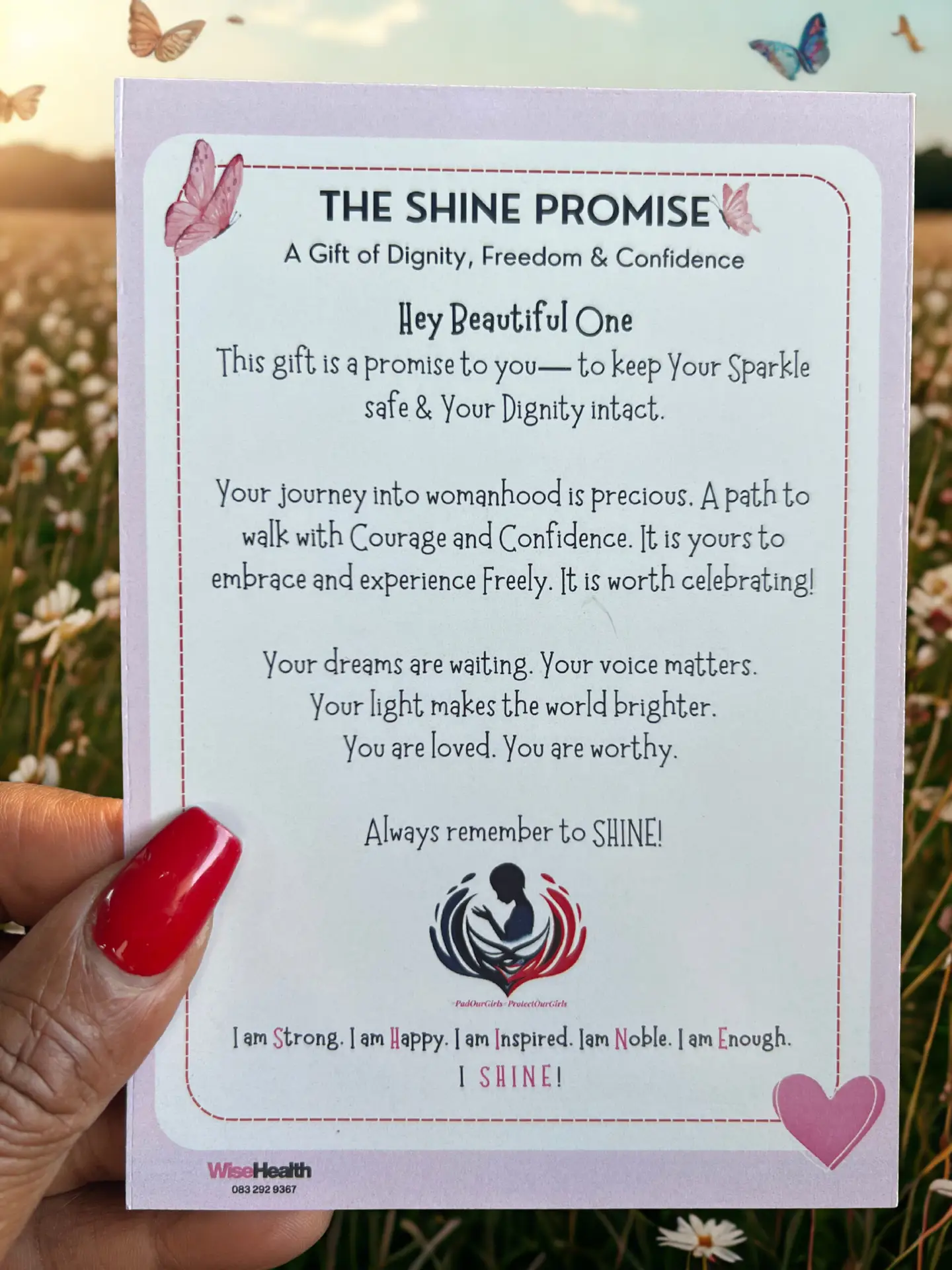 Our brand is built around the SHINE Promise, a values framework that shapes how girls discover their confidence, dignity, and inner strength. SHINE reminds her that she is Strong, Happy, Inspired, Noble, and Enough. These values help her see the beauty in her changing body, trust her voice, and walk forward with courage and dignity. The SHINE Promise, gives her language that lights her way.